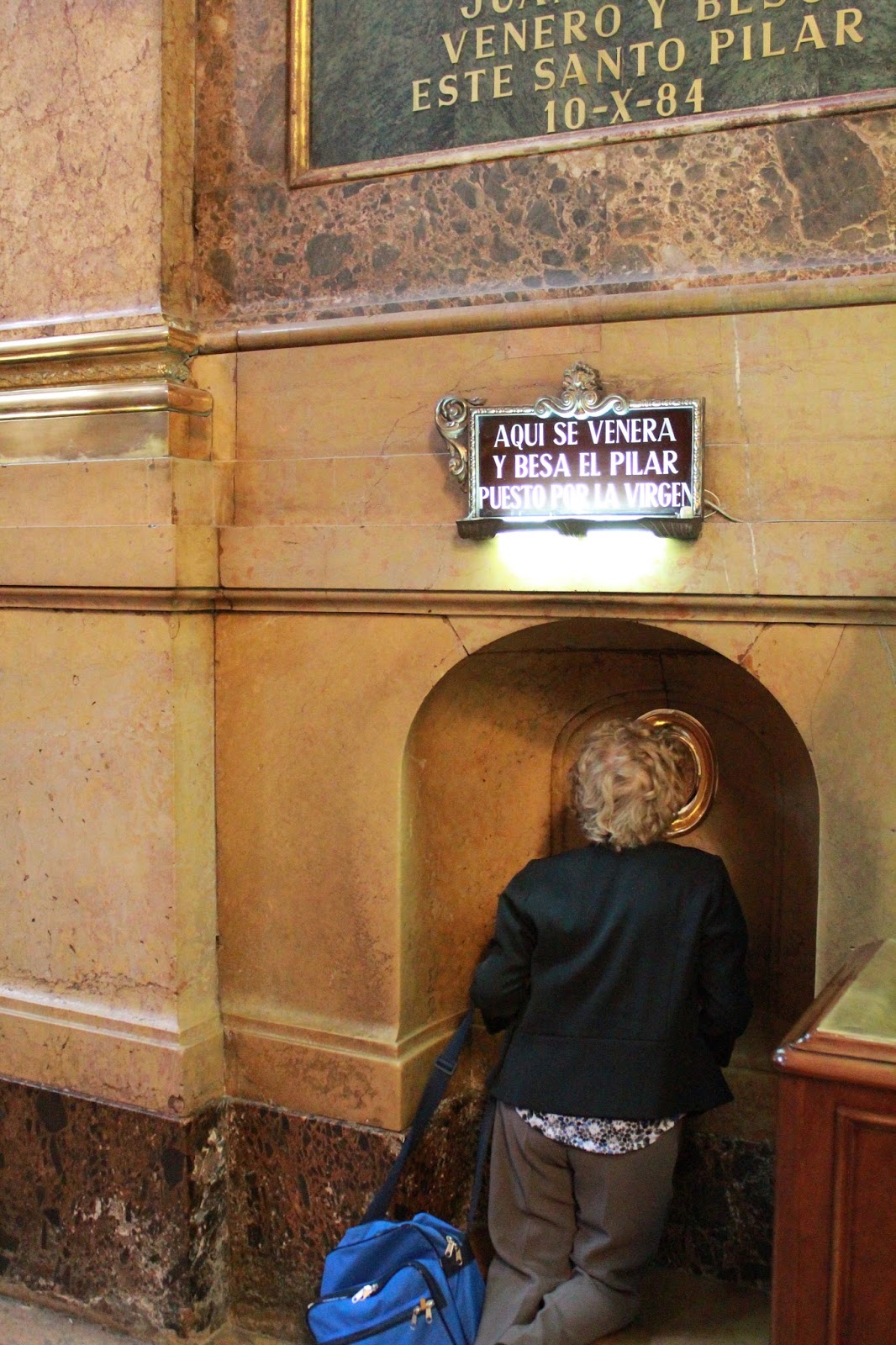 La Sagrada Columna solo aparece descubierta en su totalidad a través de un óculo abierto detrás del camarín de la Virgen, que deja completamente desnuda la superficie original del Pilar. Este óculo es el único contacto directo que los fieles tienen con la Santa Columna, donde pueden tocarlo y besarlo. Es tal la magnitud histórica y religiosa de la devoción pilarista, que la columna se encuentra hoy en día desgastada hasta formar un hueco en el que cabe un puño, a causa de los innumerables besos y caricias que los devotos dejan a diario en el Pilar.