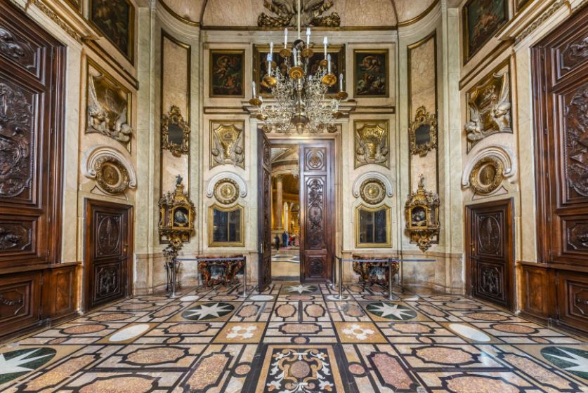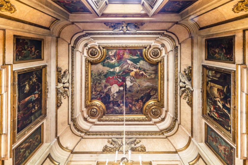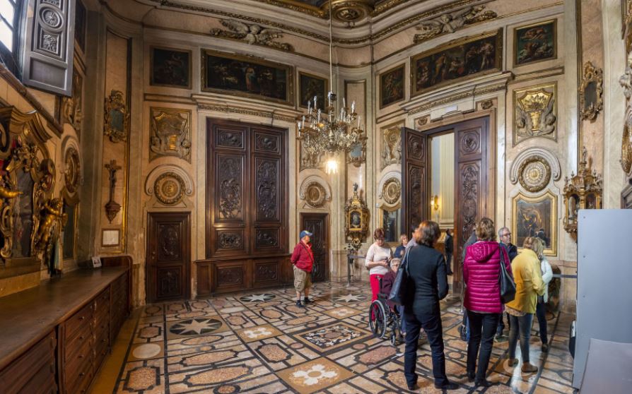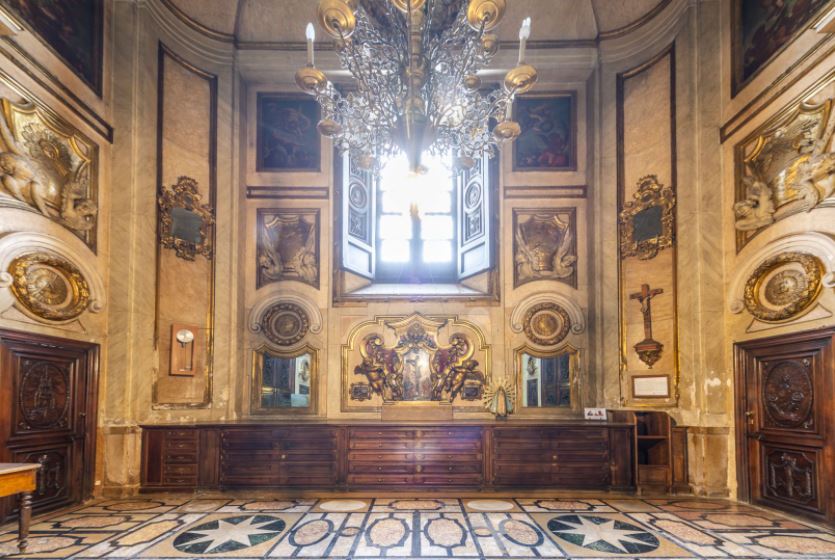 La sala, de gran suntuosidad, decorada con escultura del mismo José Ramírez y pinturas de Joaquín Inza, es de planta rectangular, casi cuadrada. Notables son el pavimento, taraceado en mármoles, y cuatro puertas labradas con estampas marianas. Destacan asimismo los armarios de nogal que hasta finales del siglo XX custodiaron las «Joyas de la Virgen», actualmente en el Museo del Pilar. En el interior de dos recargadas urnas rococó y sobre sendas a modo de bandejas, se contemplan dos cabezas degolladas policromadas de San Pablo y San Pedro muy efectistas atribuidas también a Ramírez de Arellano.